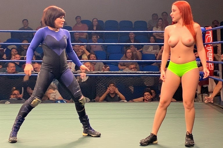 Short scenes of professional female wrestling in small arenas. Some of the wrestlers are bare-breasted