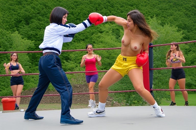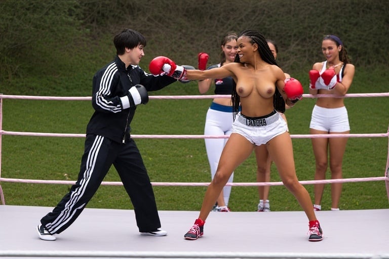 Short scenes of absolute beginners in female boxing outdoor in the garden. Many of the female boxers are bare-breasted.